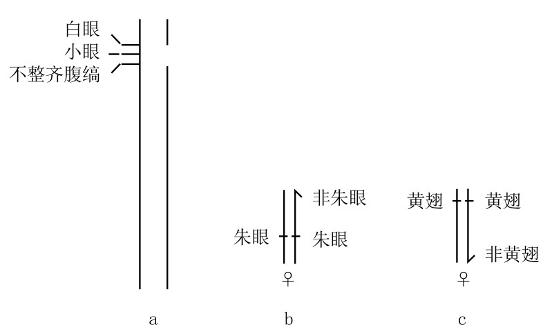 在布里奇斯和摩尔根提出的一个称为“易位”[7]的例子中,出现了另一种关系,即某染色体的片段发生脱离,该片段又连接在另外一条染色体上。这一染色体片段一直都存在,因为其携带基因,所以给遗传结果带来了复杂性。例如,X染色体上朱眼基因点附近区域的一段染色体,移接到了另一条X染色体上(如图46b)。一只雌蝇的两条X染色体上都含有一个朱眼基因,易位所得的染色体片段移接于其中一条X染色体上,尽管在X染色体的片段上也存在朱眼基因的正常等位基因,但该雌蝇的眼色仍为朱眼。乍一看,如果我们将朱眼基因视为缺失,两个缺失对于一个存在来说,似乎不能成为显性。然而,进一步分析,却可另作解释。如果朱眼基因缺失,所得的朱眼性状是剩下的所有基因共同作用的结果,那么,即使存在一个朱眼基因的显性正常等位基因,该雌蝇也会表现出朱眼这一性状。这样的情形,与一条X染色体上存在朱眼基因,另外一条染色体上存在着其正常等位基因的情形并不能等同。
