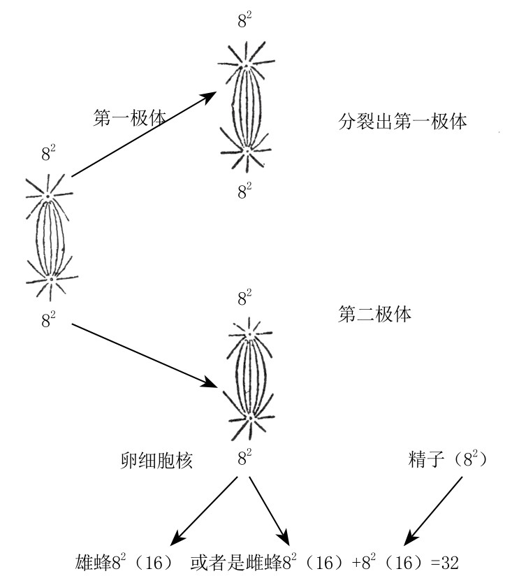 [5]根据纳赫茨海姆的观察,未成熟蜜蜂的卵细胞中有32条染色体,但由于染色体之间两两密切接合,所以看到的只有16条染色体,这16条染色体中的每一条实际上都是二价染色体或“双染色体”。在成熟分裂以前,16条染色体又一次两两密切接合,所以他所看到的8条染色体,实际上是8条四价染色体。经过减数分裂,成熟的卵细胞各自含有8条二价染色体,实际上是16条单价染色体。精母细胞原有的16条单价染色体,并未经过减数分裂,所以成熟的精细胞各得16条单价染色体。雄蜂由卵子单性发育而成,所以只有16条单价染色体(单倍体)。蜂后与工蜂各自由受精卵发育而成,所以有32条染色体。