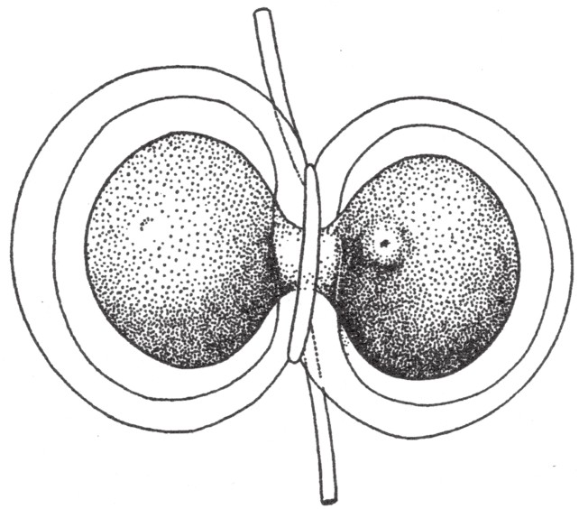 不过,从雌性和雄性的胚迹看来,染色体的一分为二似乎并未发生。要是发生了,那么,这些片段在成熟期到来之前,早就重新接合了。