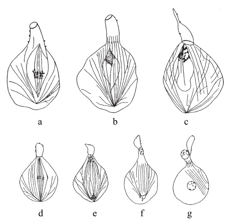 关于雄蜂是单倍体,或者至少其生殖细胞是单倍型的说法,细胞在成熟分裂时期的行动是最好的证据。第一次减数分裂是不成功的(如图86a,图86b),有缺陷的纺锤体将8条染色体连接起来,其中不含染色质的细胞质从中分离出来。(在第二次分裂时期)第二个纺锤体形成,而且染色体大概也通过纵裂分离开来(如图86d,图86e,图86f,图86g),两部分子染色体分别进入两极。由此,一个小细胞在较大细胞上面形成了。较大细胞变成了起作用的精子,它有着单倍数目的染色体。