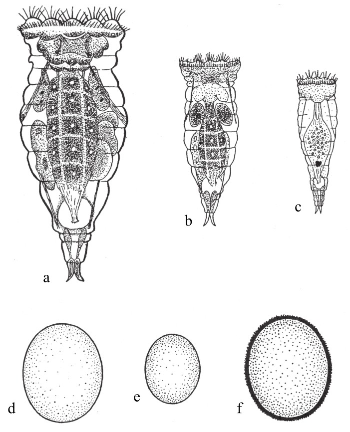 图a为senta轮虫单性繁殖的雌虫;图b为其年轻雌虫;图c为其雄虫;图d为单性繁殖的卵细胞;图e为发育成雄虫的卵细胞;图f为冬季卵细胞。