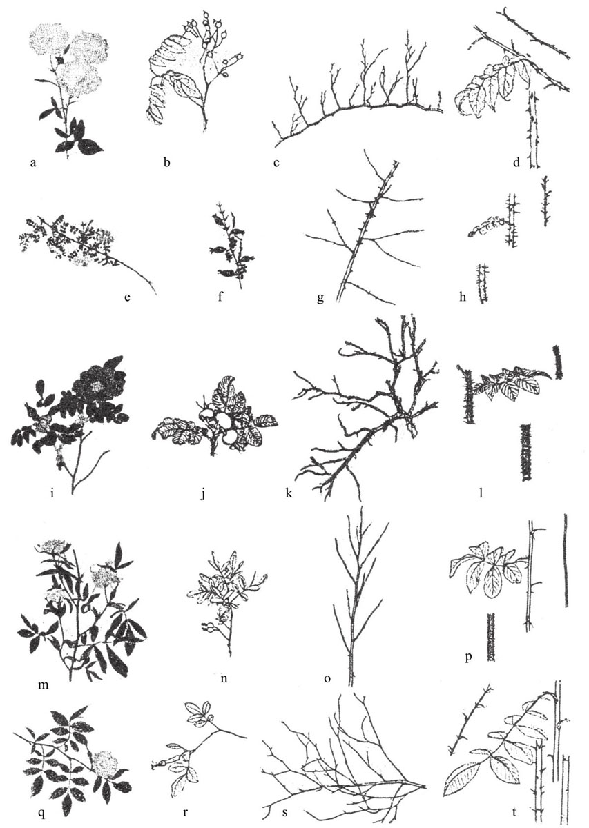 Canin蔷薇系的五种类型,即a-d,e-h,i-l,m-p和q-t。同一排表示的是同一个品种在花、果实、分枝以及刺和叶的生长处等方面的特征。