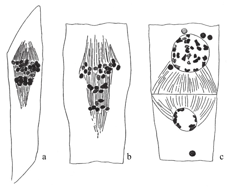 还有一些杂合子含28条染色体(4×7),但塔克霍尔姆并未将其划到真正的四倍体种系中,因为接合时期的染色体表明,每类染色体不够4条。该类型只含7条二价染色体和14条单染色体。在第一次成熟分裂期,7条二价染色体分裂开来,剩余的14条单染色体未分裂,且无规律地分布着。