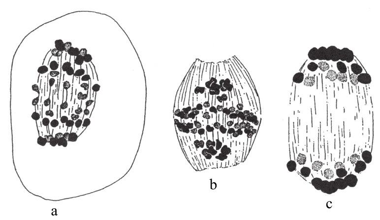 在canina蔷薇群中,只有少量杂合子的胚囊染色体有过历史记载(如图94)。有7条二价染色体位于赤道面上,其余的单染色体(21条单染色体)都集中于一极。当这些二价染色体分离之后,一半去向一极,另一半去向另外一极。结果是,一个子细胞的细胞核含有分裂所得的7条子染色体和所有21条单染色体(共计28条),而另外一个子细胞的细胞核只含7条子染色体。如果这个有着28条染色体的卵细胞继续发育,且与另外一个含有7条染色体的精子(假设这种花粉细胞的精子不发挥作用)结合,那么受精卵会含有35条染色体,即和原始型的染色体数相同。