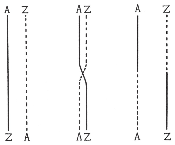 在图104的下部分,展示了次级型的三条染色体的不同接合方式。总而言之,其接合方式和初级型的接合方式相差无几,但在出现频率上还是有差异的。差异最显著的是后面的两种类型(右边)。其一是初级型的三条染色体中的两条组合形成圆环,另一条位于圆环中间,而次级型的三条染色体形成了一个细长的圆;其二是初级型的三条染体中的两条染色体组合形成了一个圆,另外一条染色体为棒状,而次级型的三条染色体中的两条组合形成圆环,另一条单独形成圆环。这两种类型的差异在某种程度上说明某条染色体的尾端可能有所改变。贝林和布莱克斯利给出过一个假设,以阐述三倍体亲代或三体初级型的前一时期的这些变化是如何引起的。例如,假设两条染色体像图105所示的那样,会颠倒过来并接合,又假设两条染色体在中间部位发生了交换,致使相同基因并列在唯一的平面上交换,结果使每条染色体的两端相似,其中一条染色体的两端为A、A,另一条染色体的两端为Z、Z。如果这样一条染色体变成下一代三价染色体中的一条,那么就极有可能构造出如图106(下面部分)所示的接合模式。图中,ZZ染色体和正常的两条染色体接合在一起,相似的末端相互接合。