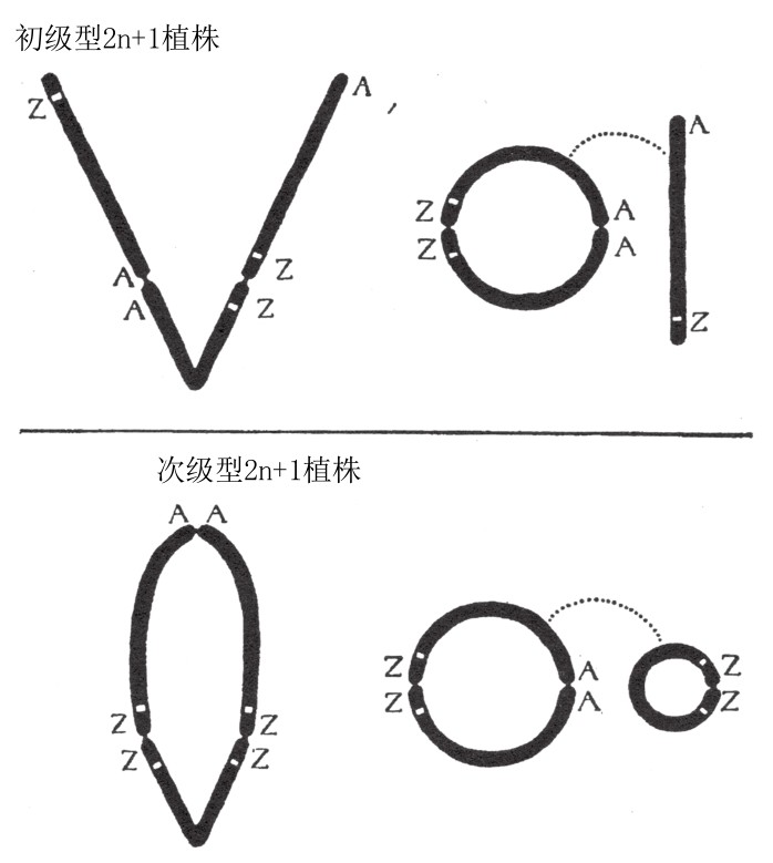 如果次级型特有的圆环能按照上述所说来解释,那么三价染色体中的一条会有半截是重复的,从而与其余两条不同。因此,次级型的基因组合与初级型的基因组合方式不同。