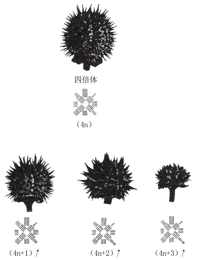 图上部分表示四倍体曼陀罗的蒴果,下部分分别表示4n+1,4n+2和4n+3型的蒴果。