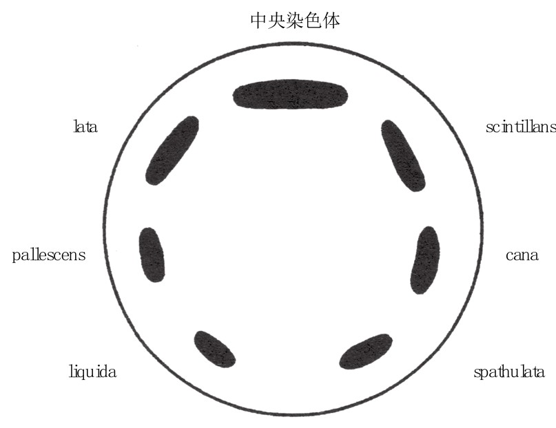 这六种初级突变型都包含了其次级突变型。初级突变型和次级突变型之间的相互关系,不仅表现为性状上的相似性,也表现在两者互相转变的频率上。其中,albida和oblonga两型,各有两种卵细胞和一种花粉细胞,被称为one-and-one-half型或sesquiplex突变型。另外一种次级突变型candicans,也是一种sesquiplex型。图107中,染色体组群内的中央染色体,也是最长的一条染色体,其携带volutine的一些“因子”,或lata的一些“因子”。根据莎尔所找到的证据,德弗里斯将新突变型funifolia和pervirens纳入它们的次级突变型之中。因此,按照莎尔的观点,似乎拉马克待霄草的其他五种突变型[7],以及含有使这些因子维持平衡致死状态的若干致死因子的突变型,多半都属于这一群。莎尔阐述道,这些隐性性状的出现,是由于这里暂时被认定为中央染色体的一对染色体发生了交换。