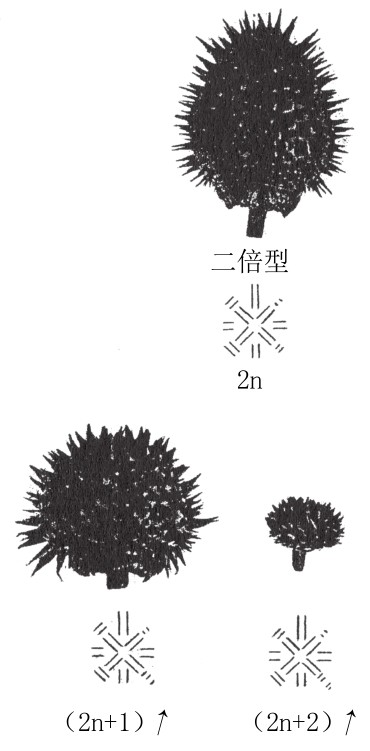 二倍体曼陀罗(2n)的蒴果和2n+1、2n+2两种类型的蒴果比较。