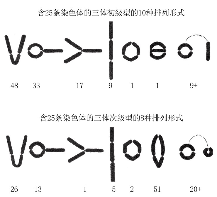 贝林和布莱克斯利在对曼陀罗三体初级型和三体次级型做比较时,对三条染色体的接合模式做了研究,他们发现了两者间有明显的差异,这对研究两种类型间的关系有一定启示作用。图104的第一行,展示了初级型染色体的三条染色体的各种接合方式。每种接合方式下的数字表示该类型发生的次数。在所有这些类型中,最常见的接合形式便是V型(48次),其次是戒指加大棒型(33次),之后是Y型(17次),之后是链条型(9次),之后是环型(1次)和双环型(1次),还有一种是两条染色体形成圆环,剩下的第三条染色体单独出现在右边(9次以上)。既然假定相似尾端的染色体会接合在一起,那么我们有理由假定,在这些类型中有着相似尾端(A和A,Z和Z)的染色体仍是相互连接的(如图104上端)。