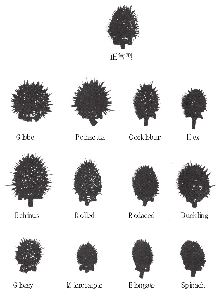 stramonium曼陀罗的蒴果的原始类型(最上端的那个),以及12种有可能出现的三体型。
