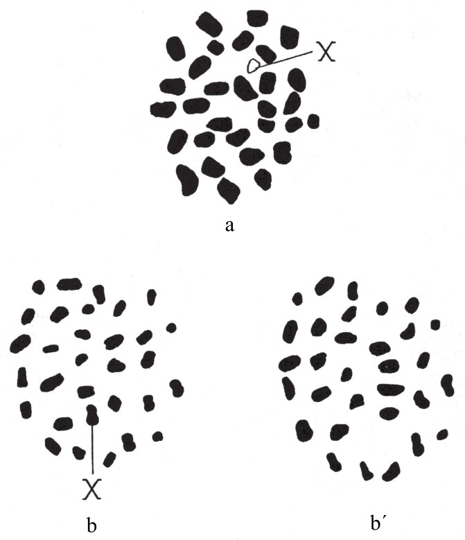 图a为Fumea casta型雌蛾的卵细胞减数分裂后的染色体群;图b和图b´为卵细胞第一次成熟分裂时两个极体的染色体群。单条X染色体只存在于某一极。