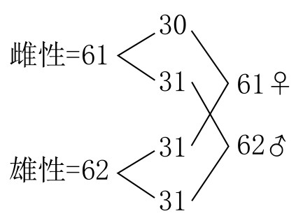 Fumea casta型雌蛾有61条染色体,雄蛾有62条染色体。卵细胞中的染色体接合之后,会有31条(图122a)。在第一次分裂出极体时,30条二价染色体分离后分别进入相反的两极;第31条单价染色体在未分裂的情况下随机进入某极(如图122b和b´)。结果,有半数卵细胞含有31条染色体,半数卵细胞含有30条染色体。在第二次分裂出极体时,所有染色体一分为二,所得子细胞中染色体的数目和分裂之前的数目相同(即30或31)。当精细胞成熟时,染色体会接合成31条二价染色体。在细胞的第一次成熟分裂期,每组染色体(即二价染色体)会分离开来;在细胞的第二次成熟分裂期,分离而来的染色体又会一分为二,每个精子都会含有31条染色体。卵细胞受精后可得到下列组合: