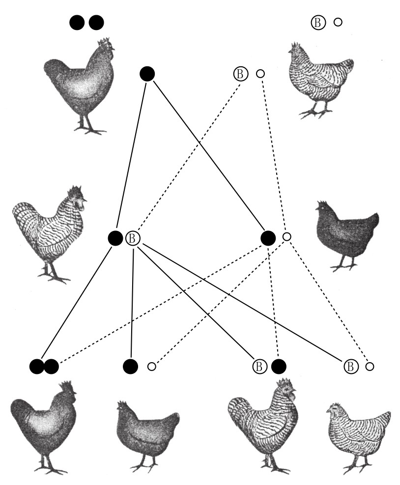 鸟类的遗传学证据是毋庸置疑的,这一证据源于性连锁遗传。如果让黑色狼山型公鸡和花纹Plymouth rock型母鸡交配,所得雄性个体都有花纹,而雌性个体都是黑色的(如图120)。如果Z染色体携带分化基因,则预期所得结果应和上述相同,因为子一代的雌性会从其父代得到Z染色体。如果让子代的后代杂交,会得到花纹公鸡、花纹母鸡、黑色公鸡、黑色母鸡共四种类型,比例为1:1:1:1。