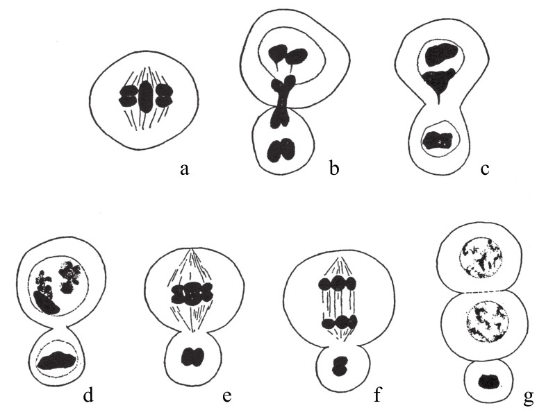 熊果蚜的两次成熟分裂。在第一次分裂时,图a到图c表示X染色体进入一个细胞。在第二次分裂时,图e、f、g展示了所得细胞(含有长X染色体的细胞)再一次分裂,产生了两个有作用的成雄精子,而另一个发育不全的细胞(也就是不含X染色体的细胞),不再分裂。