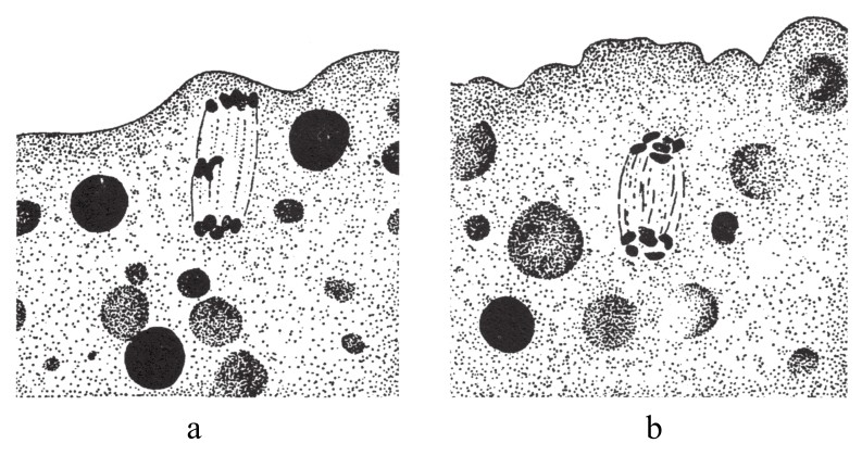 更为有趣的是会产生成雄卵细胞[9]的瘤蚜雌虫,它所产出的卵细胞比单性生殖时产出的卵细胞小。因此,成雄卵细胞是否能存活,早在X染色体从卵细胞中排出之前就可定论了。在此,雌雄性别似乎取决于卵细胞的大小,也就是说,取决于卵细胞内胞质含量的多少。但这一猜测,却与事实相悖,因为卵细胞只有排出半数的X染色体才能成为成雄卵细胞。如果这些X染色体都保留在卵细胞内,我们也不知道会发生什么,或许这个卵细胞会发育为雌虫吧。无论如何,我们知道,是母体内的某种变化导致较小卵细胞(也称为小卵)的形成,而该小卵细胞导致X染色体的减少,继而得到雄虫。至于母体内的变化有何性质,目前我们还不知晓[10]。