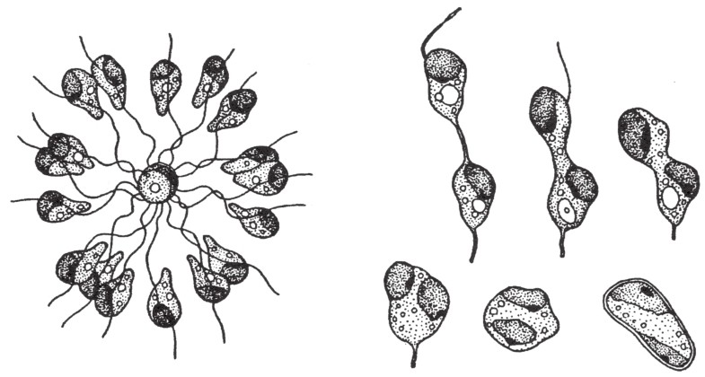 在《相对的性别之研究》这本书中,哈特曼(Hartmann)对他从海藻(长囊水云)上观察所得的研究结果作出如下描述。这些从植株中游离出来的自由移动的游动孢子[23]是极其相似的,但根据其后期的行为,我们将其分为两类:“雌性”和“雄性”。前者(雌性)很快就会停顿下来,然而后者(雄性)会成群地继续游动一段时间,并且围绕着雌性个体运动(如图138)。