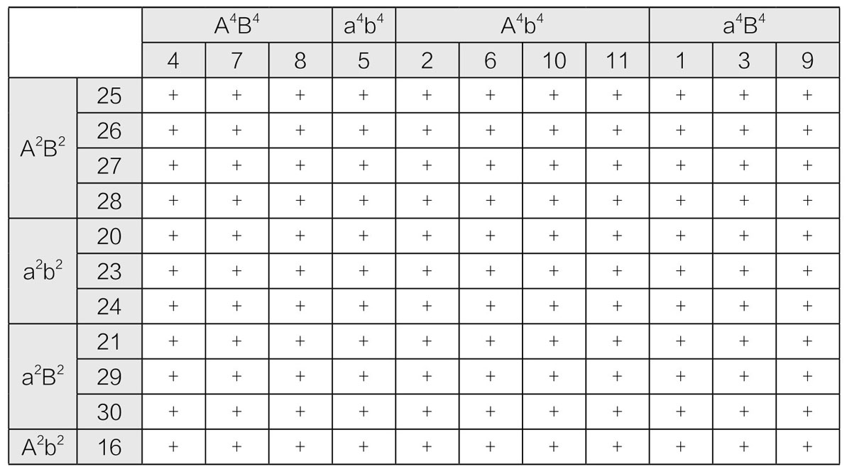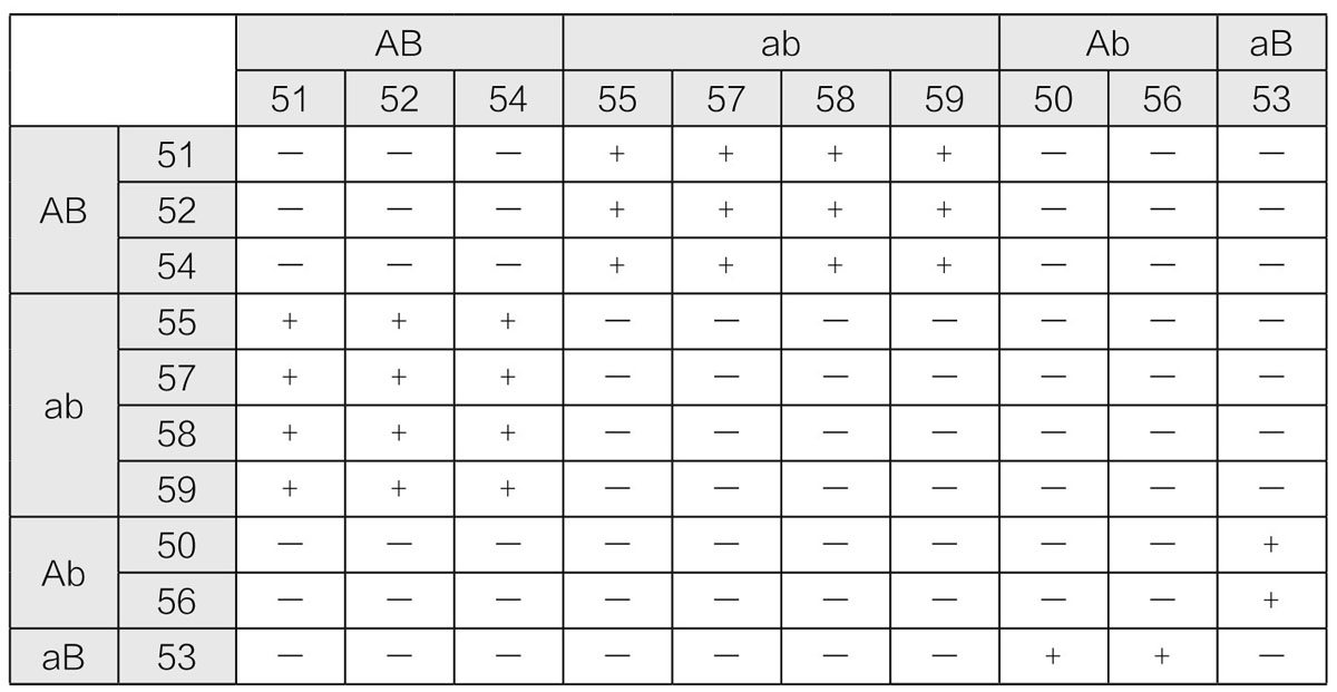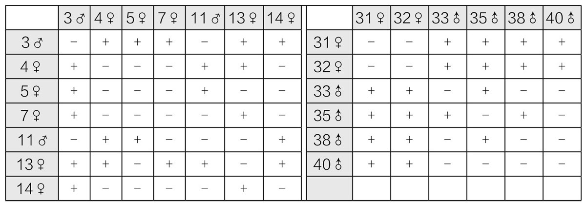 现在,对源于相同品系(生长在同一地区的植株)的单孢子型菌丝体加以鉴定,所得结果如表11所示。此处,用“+”表示两株单孢子型菌丝体接合后会呈现出锁状连合(两者为不同性别),用“-”表示不会呈现出锁状连合(两者为相同性别)。图表中,我们将菌丝体分为四类(属于相同组的菌丝体被安排在一起)。这一结果被解释为,这里所研究的墨汁鬼伞菌[20]中一个子实体中的孢子,属于四个不同的性别群。