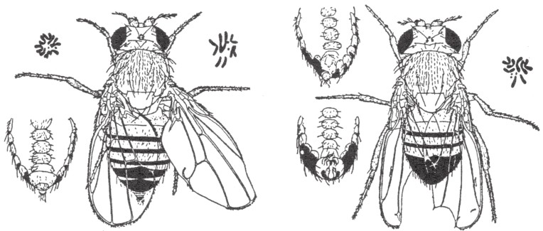 左侧所示为性中型雌性果蝇的背部和腹部图片。其染色体组中出现两条X染色体,三条较大的常染色体(Ⅱ和Ⅲ),以及通常会出现的一条第四染色体(Ⅳ染色体,这里出现了两条)。右侧所示为性中型雄性果蝇的背部和腹部图片。其染色体组中出现两条X染色体,三条常染色体(Ⅱ和Ⅲ),以及两条第四染色体(这里出现了三条)。