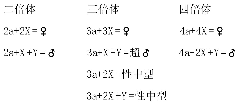 布里奇斯从上述染色体间的特殊关系得出以下结论:性别取决于X染色体和其他染色体之间的平衡。我们可以这样设想,X染色体上含有更多使个体发育为雌性的基因,而Y染色体上含有更多能使个体发育为雄性的基因。正常的雌蝇是2a+2X,两条X染色体使平衡偏向于雌性,而正常雄蝇只有一条X染色体,平衡更多偏向于雄性。三倍体3a+3X雌蝇和四倍体雌蝇4a+4X所达到的平衡,与普通的雌蝇所达到的染色体平衡一样,自然其性别表现也同普通雌蝇的一样。四倍体雄蝇是4a+2X+Y(不过最近还未得到这种个体),其所达到的平衡和普通型雄蝇一样,预计它的性别表现也与普通雄蝇的相同。
