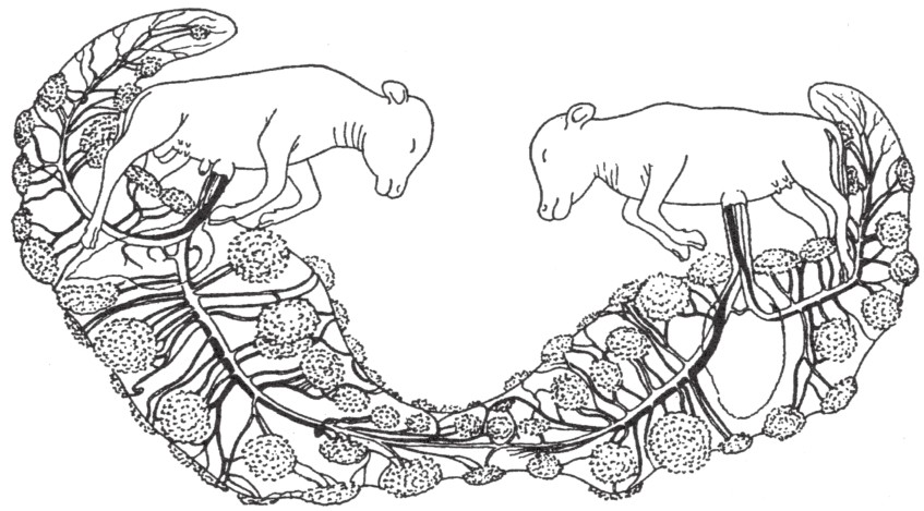 早在很久以前,人们就知道若有双生牛犊[4],那么有一头会是正常的雄性,另一头会是不具备生殖力的“雌性”,被称为“雄化雌犊”。雄化雌犊的体外生殖器一般呈雌性特征,或者说更像雌性,而非雄性,不过也有人证实其生殖腺与睾丸(或精巢)相似。坦德勒(Tandler)和凯勒(Keller,1911)表示,双生牛犊由两个卵细胞发育而成,利利(Lillie,1917)已经完全证明了这一事实。坦德勒和凯勒也指出,两个胚胎在子宫中借助绒毛膜[5]的连接,建立起循环上的联系(如图141)。马格努森(Magnussen,1918)描述过大量不同年龄段性器官不发达的雄化雌犊,并且通过组织检查来展示性器官不发达的老龄雄化雌犊有着发育良好的睾丸状生殖器官,即其具备睾丸的特殊管状结构,包括睾网管、性索和附睾。沙潘(Chapin,1917)和威利尔(Willier,1921)证明了这些观察,威利尔还特别细致地解释了卵巢从未分化时期向类睾丸结构转化的“不同阶段”。