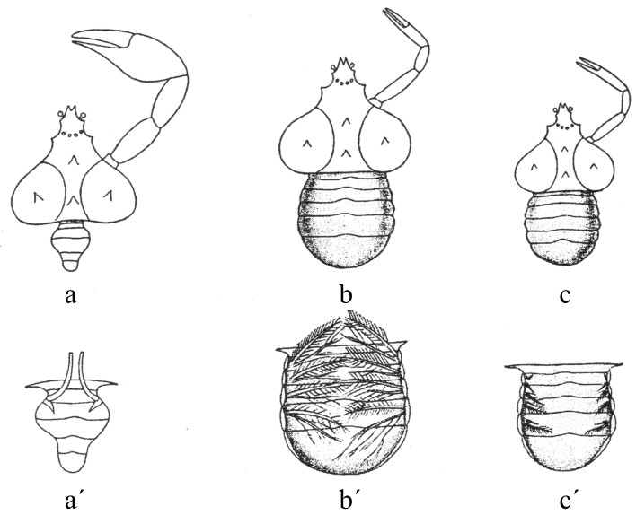 图a为正常雄蟹,a´为其腹部;图b为正常雌蟹,b´为其腹部;图c为被寄生的雄蟹,c´为其腹部。