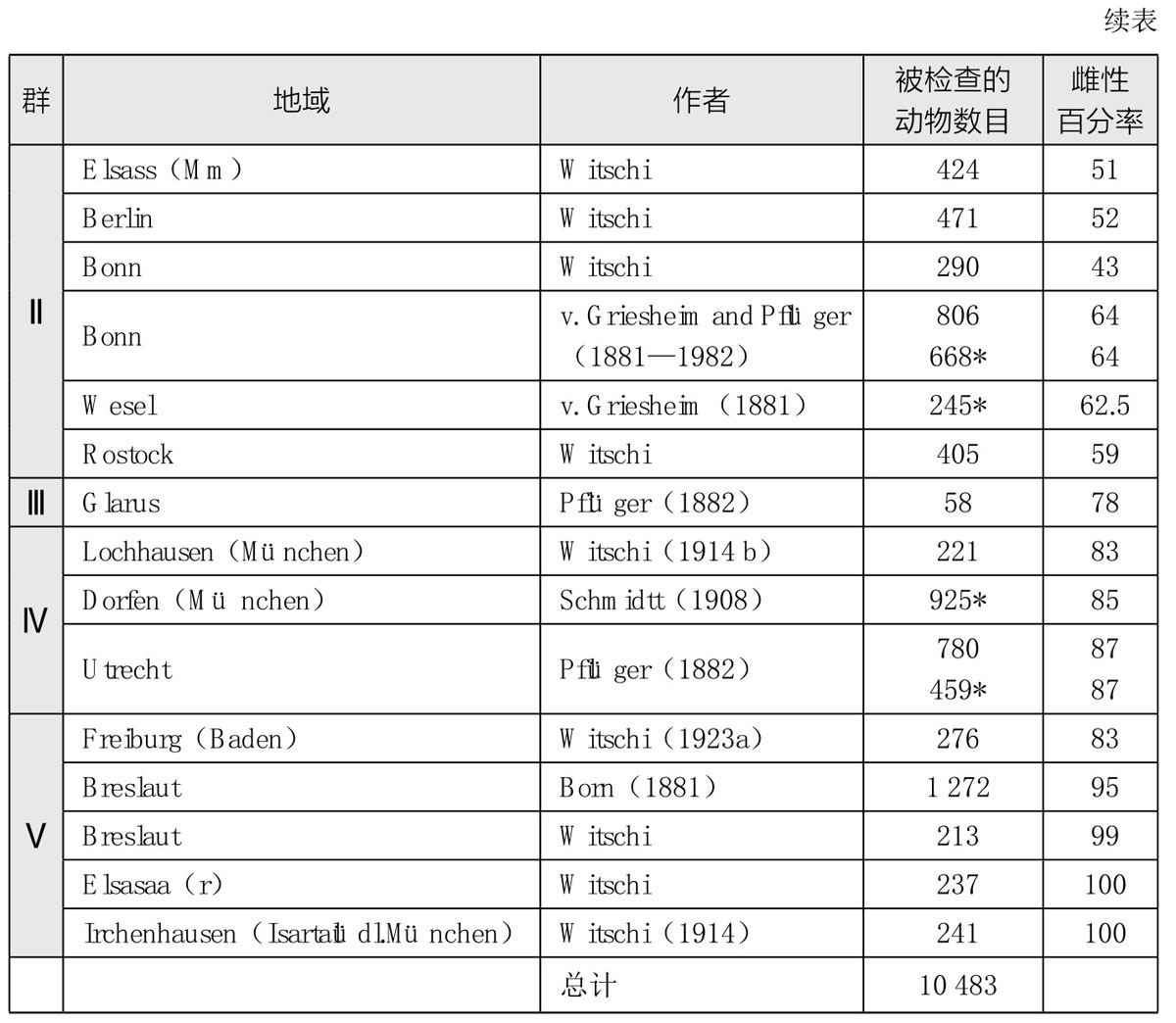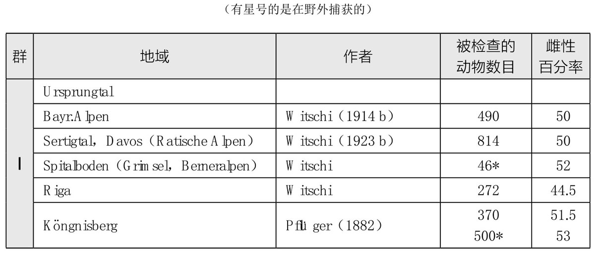 维奇将德国和瑞士不同地区的不同观察者所报道的山蛤的性别比例汇集在一起,结果如表14所示。最右边一栏表示雌蛙所占的比例。我们会看到前两组(第Ⅰ组和第Ⅱ组)的雌雄比例接近1:1,而后三组(第Ⅲ组、第Ⅳ组和第Ⅴ组)的比例中,雌性占比更高,这些地区中还有一对雌雄所生的个体全是雌蛙(100%)的情况。这些蛙,都属于中性族。