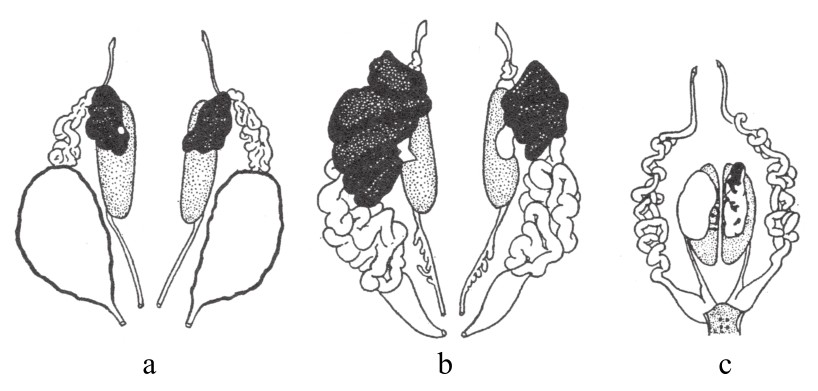 自从普夫吕格尔(Pflüger)在1881—1882年经研究给出有关幼蛙的性别比率以来,大家都知道从蝌蚪发育到青蛙的变态时期内,生殖腺往往表现为中间状态。分化所得个体究竟是雌是雄,引发了很多争议。近年来,有研究证明,这些性中型往往会变成雄蛙,而且有人断言,很多蛙类的雄蛙都会经历这一阶段。