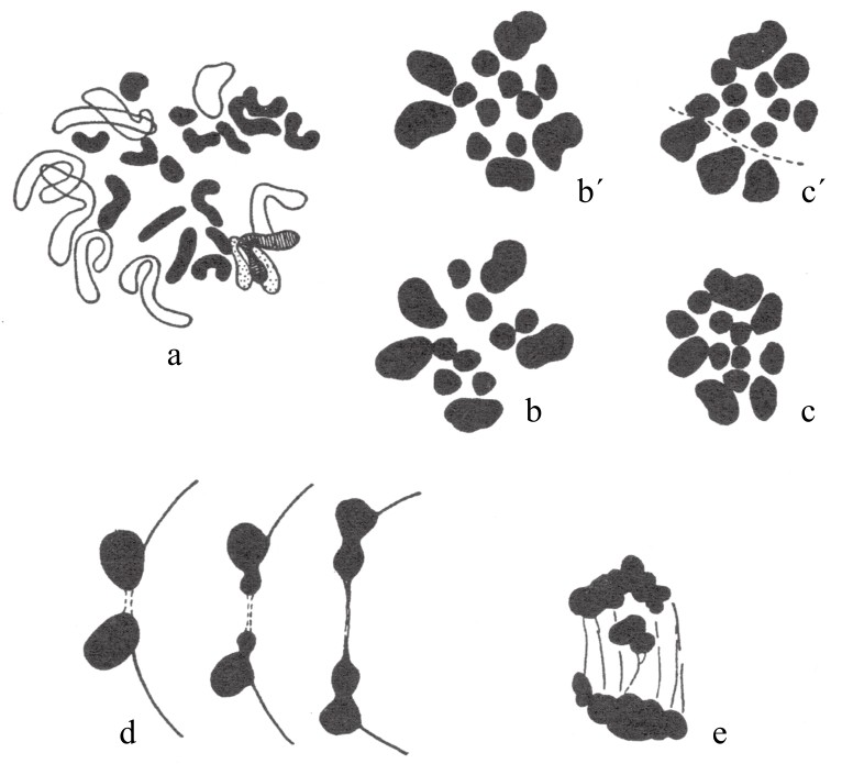 欧洲山蛤的染色体群。图a为二倍体雄蛙染色体群;图b和图b´为精母细胞第一次分裂的后期,其各有13条染色体;图c和c´同前;图d为精母细胞的X、Y染色体的第一次分裂;图e为精母细胞的X、Y染色体的第二次分裂。
