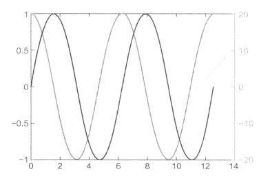 MATLAB中有完整的、专门的数据可视化函数和工具,可供用户方便地将复杂的计算结果显示成各种对应图形。下面给出一些用MATLAB进行数据可视化的例子。图1-2是用MATLAB中的plotyy函数绘制的双y轴曲线。图1-3是用MATLAB中的peaks函数和surfc函数生成的数据的曲面和等值线。