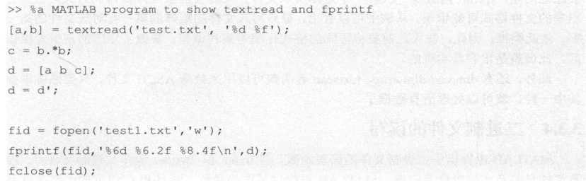 文本文件几乎是数据处理中最常用的数据交换格式。MATLAB提供了若干个针对文本文件的读写函数,这里重点介绍textread和fprintf。具体用法读者可以自行学习,这里只用一个例子来说明这两个函数的用法。