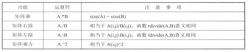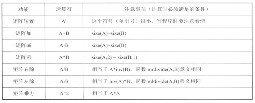 此处所说的基本操作包括矩阵的四则运算、乘方等。前面已多次提到,MATLAB中矩阵是基本的数据结构,因此大部分(也可以是全部)运算都可直接针对矩阵进行,见表4-1。