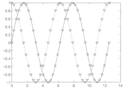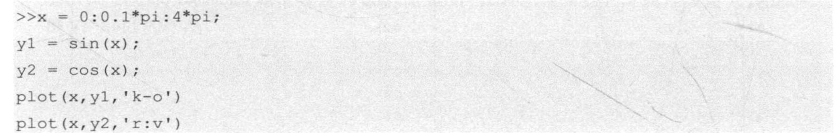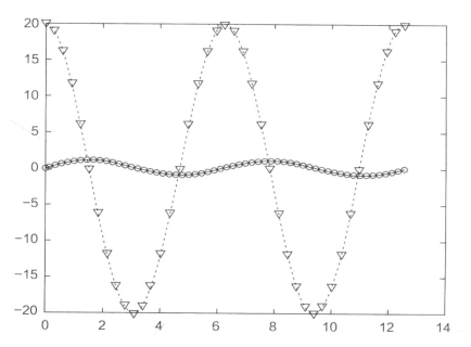 对比图5-4与图5-8,可以发现这两个图效果完全相同,也就是说,这两种方法都可以实现将不同曲线绘在同一图形上。但有些时候,曲线也需要一个一个绘制。例如,要绘制20条类似的曲线,如果按例3中的方法来绘制则太麻烦了,而用例7中的方法,则可以通过一个循环语句完成这个功能。有时候,不同的曲线绘在同一张图中是有问题的,如例8所示。