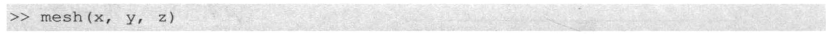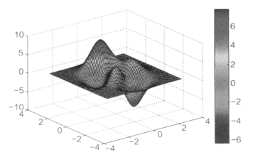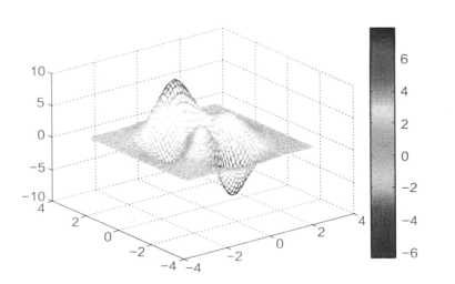 生成的图形如图5-15所示。MATLAB中的mesh函数生成三维网格。其中同时用线条颜色表示曲面的高度。用colorbar可以显示一个色标,如图5-16所示。