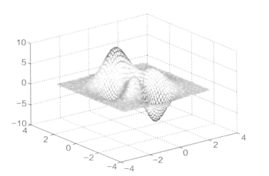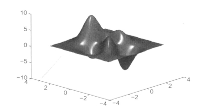 MATLAB中的surf函数同样可表示三维曲面,如图5-17所示。对比图5-16和图5-17可发现,mesh中用线条的颜色表示高度,而surf用面的颜色表示高度。事实上,surf对应的是计算机图形学中的曲面绘制,其机理更为复杂。用surf还可以给曲面加光照效果,如图5-18所示。