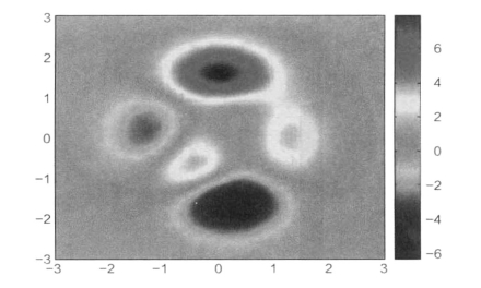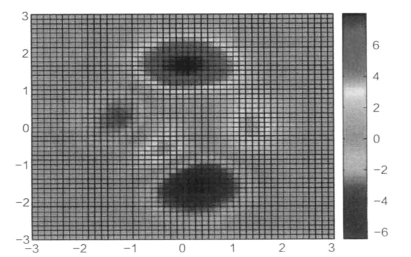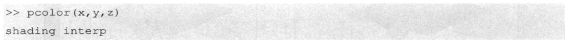 图5-19中将每一个数据用一个颜色块来表示。一个颜色块相当于图像中的一个像素。但这个图看起来“分辨率太低”,可以用shading函数将颜色块进行插值,使之更细腻,如图5-20所示。
