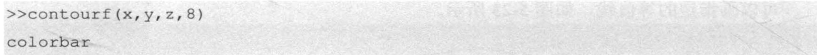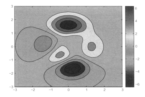 如果不想用标度表示高度信息,可以用颜色或颜色填充来表示。MATLAB中的contourf函数可以完成此任务,如图5-25所示。
