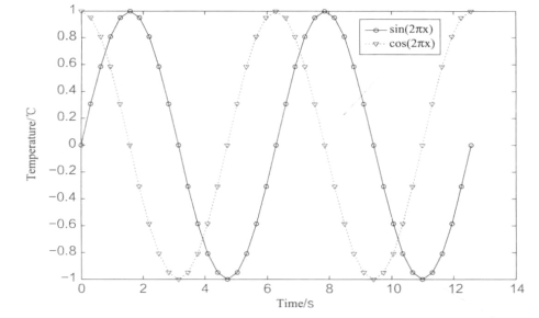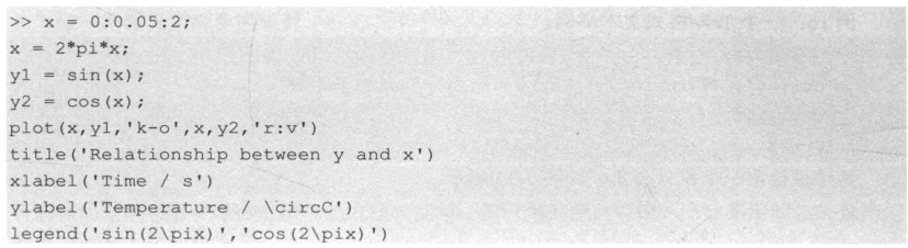 图形说明一般均为字符串。需说明的是,有些符号是不能用键盘直接输入的,如例15中的π、℃等,这时就要用TeX[3]格式了。事实上,图形的标注项最终都生成MATLAB的Text对象(绘图元素)。Text对象有一个属性为“interpreter”,该属性可用于设置Text的解释系统(即翻译系统),默认情况下,此属性设置为“tex”,也可将其设置为“latex” [4]。这样,就可以在文本中使用TeX或LaTeX的命令了。TeX是一个高级的排版系统[5],因此读者完全不用担心有符号或公式打不出来。