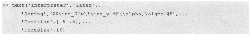 但对于普通应用者来说,可能用到的就是写一两个希腊字母这点功能。在TeX中,希腊字母及各种符号均对应一个TeX命令。常用命令可在“Help” → “MATLAB”→“Functions(alphabetical list)”→“text” → “property list”→“string”中查询。