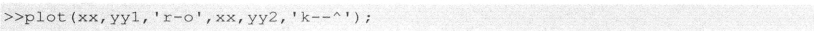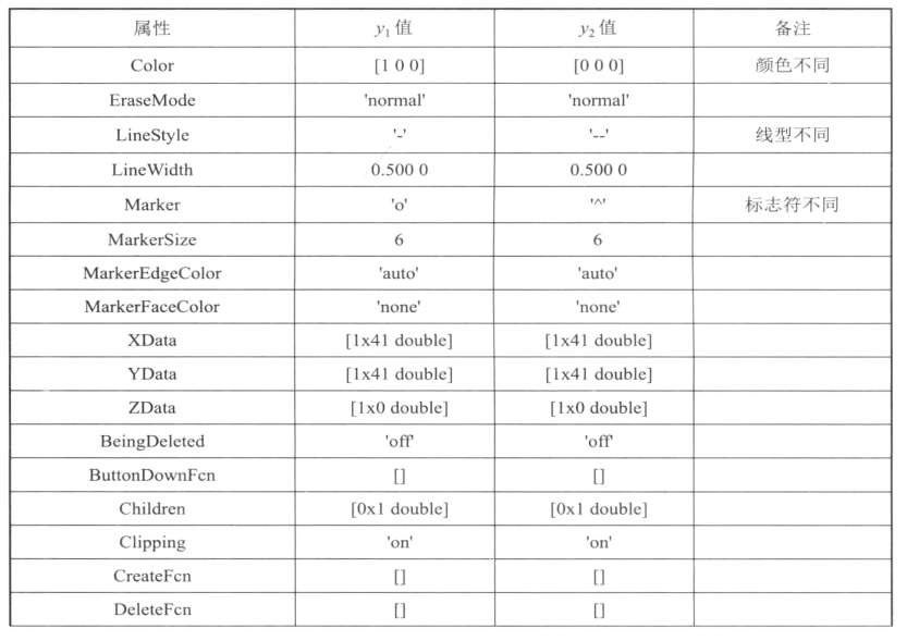 用get函数可以查看两个Handle的属性。get(h(1))和get(h(2))可以列出两个曲线的所有属性,两者的对比见表5-4。从表中属性可以看出两条曲线的相同和不同之处。