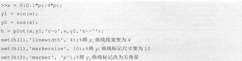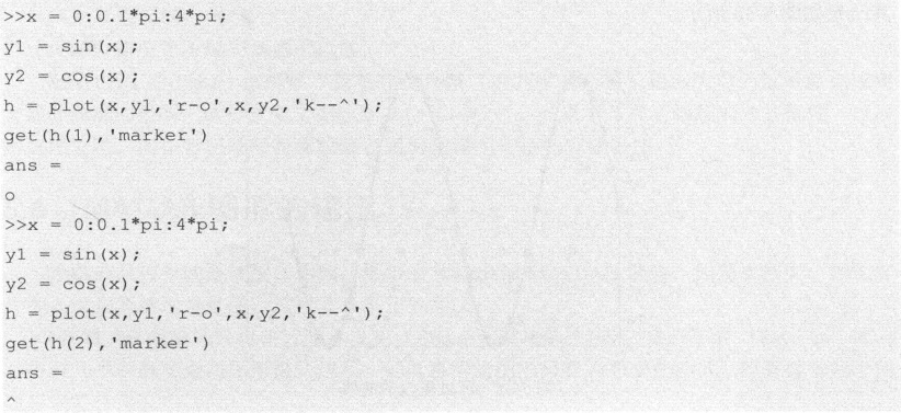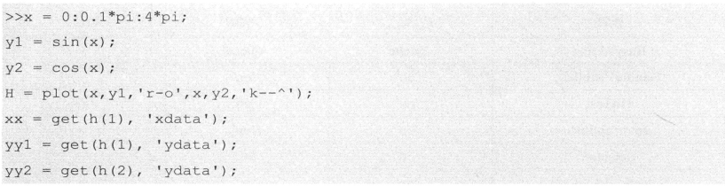 如果仔细查看MATLAB的“Help”,会发现几乎所有的绘图函数都提供了返回所绘对象句柄的调用形式,如果想获得句柄,在绘图时采用这些调用形式就可以了。上面的例子就是这样做的。