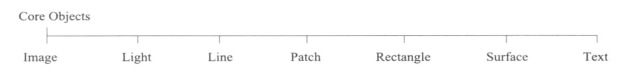 Axes下面最核心的是“Core Objects”,其下包括了7种MATLAB的基本绘图元素(图5-37),MATLAB所有的图形都是由这7种绘图元素构成的。如例3中绘制的曲线属于“Line”;图5-26中的填充等值线属于“Patch”等。具体的细节请读者通过“Help”自行学习。