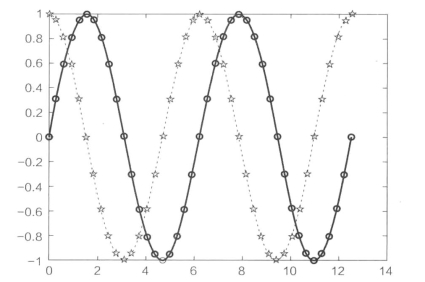 有了前面的知识,读者可以明白上面的程序是用红色的细实线(数据点用圆圈表示)画了一条正弦曲线和一条余弦曲线,如图5-4所示。与前面例子不同的是,plot函数返回了一个参数h。