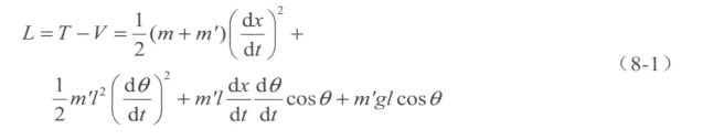 如图8-1所示,沿直线水平轨道建立Ox轴,以x表示滑块在轨道上的位置,以θ表示摆杆与竖直线的夹角。则系统的拉格朗日函数为