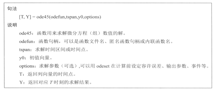 上述微分方程组比较复杂,用dsolve求解解析解非常耗时,且不一定可行。在实际应用中,对于复杂的微分方程(组),很多时候解析解是很难得到的,因此经常以求解数值解来代替解析解。本节介绍一个求解微分方程数值解的函数—ode45。ode45采用四阶和五阶Runge-Kutta单步算法,用变步长求解器求解非刚性常微分方程,其解具有二阶精度。在MATLAB中,ode45是解决微分方程(组)数值解问题的首选方法。