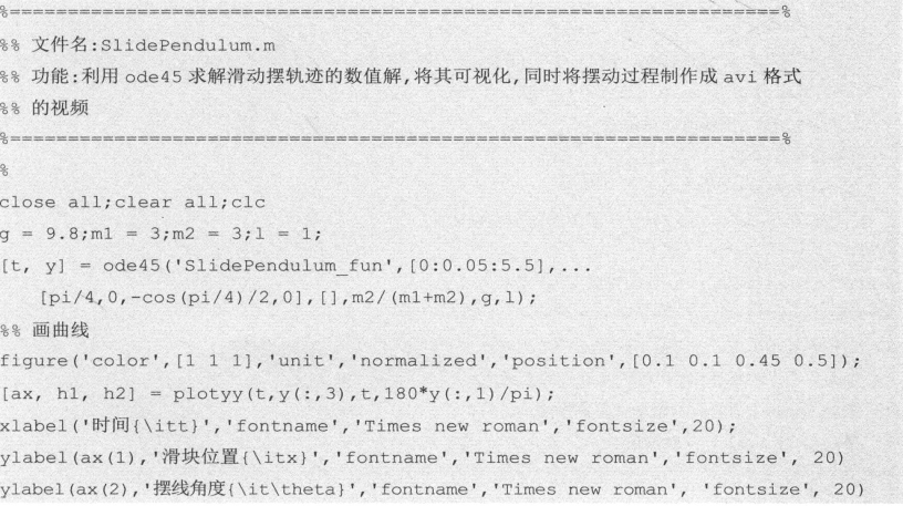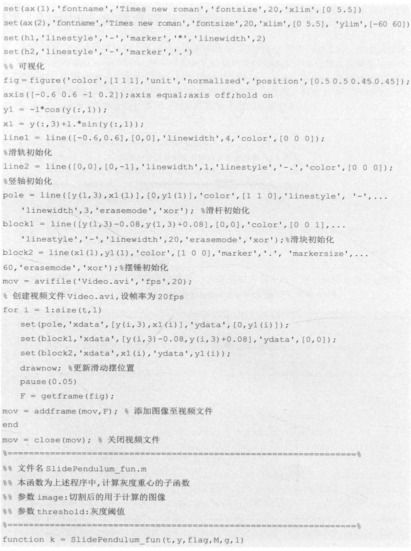 为了更直观地了解滑动摆滑块与摆锤之间的相对运动,可以利用MALTAB的可视化功能对滑动摆的运动进行可视化模拟。滑动摆的可视化过程与上一章傅科摆可视化类似,这里不再赘述,只给出程序。