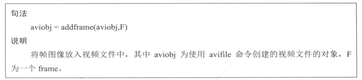 由前面的叙述可知,生成视频文件最重要的一步是填充frame。填充frame用addframe函数实现,其格式为: