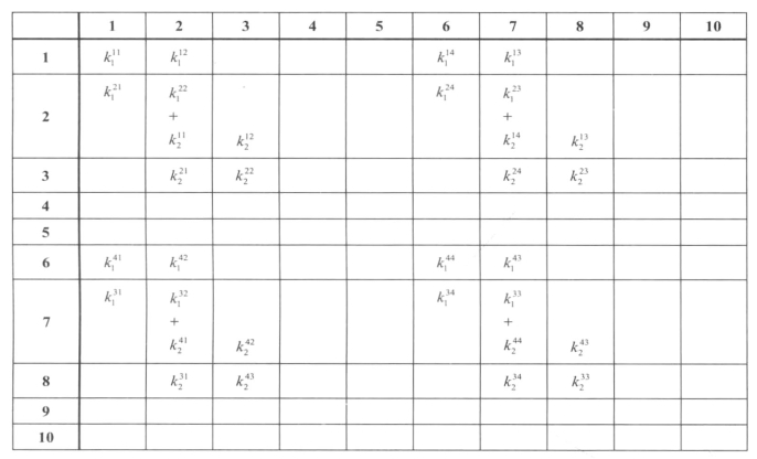 首先组装单元1,此时的总刚度矩阵所有元素均为0。单元1的刚度矩阵为k1。单元1中4个节点依次对应整体模型的编号是1、2、7、6(按逆时针顺序)。将k1中分块矩阵的下标1、2、3、4依次用1、2、7、6代替,并叠加到K矩阵的对应标号的分块矩阵上。单元1组装完成后,再对单元2进行组装。前两个单元组装完成后的K如图10-4所示。