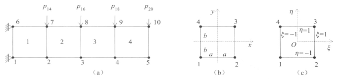 将模型划分为若干个单元。本例中选用平面四节点矩形单元,将模型划分为4个单元,并给单元和节点编号,如图10-3所示。