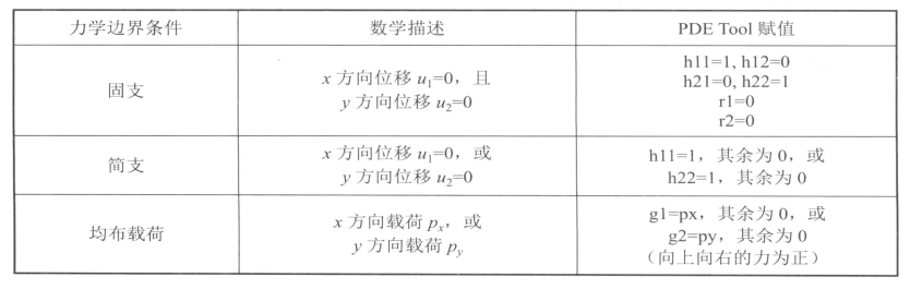 从前面的实例演示不难看出,应用PDE工具箱求解平面应力问题和平面应变问题最为复杂的步骤就是给边界条件赋值,在边界条件设定好后,后面的求解就很简单了。对于力学问题的给边界条件赋值,可简单总结为:位移边界条件对应的是Dirichlet类型,力边界条件对应的是Neumann类型。
